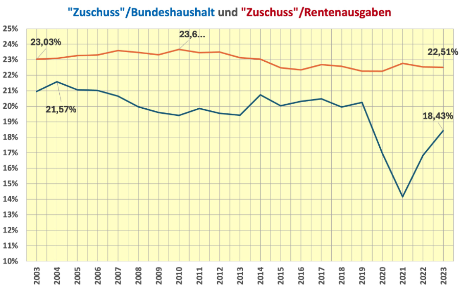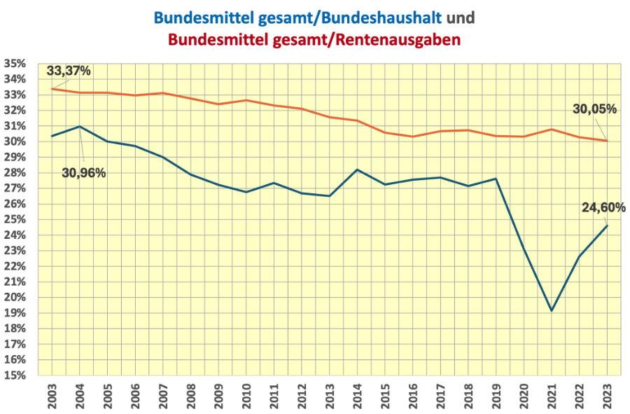 Bei Betrachtung der geleisteten Bundesmittel zur Rentenversicherung ist ein eklatantes Absenken erkennbar. Der Anteil am Bundeshaushalt ist von 31 Prozent im Jahr 2004 auf 25 Prozent im Jahr 2023 gesunken (Der nur scheinbare Einbruch 2022 bis 2033 ist auf die exorbitant hohen „Corona“-Haushalte zurückzuführen).