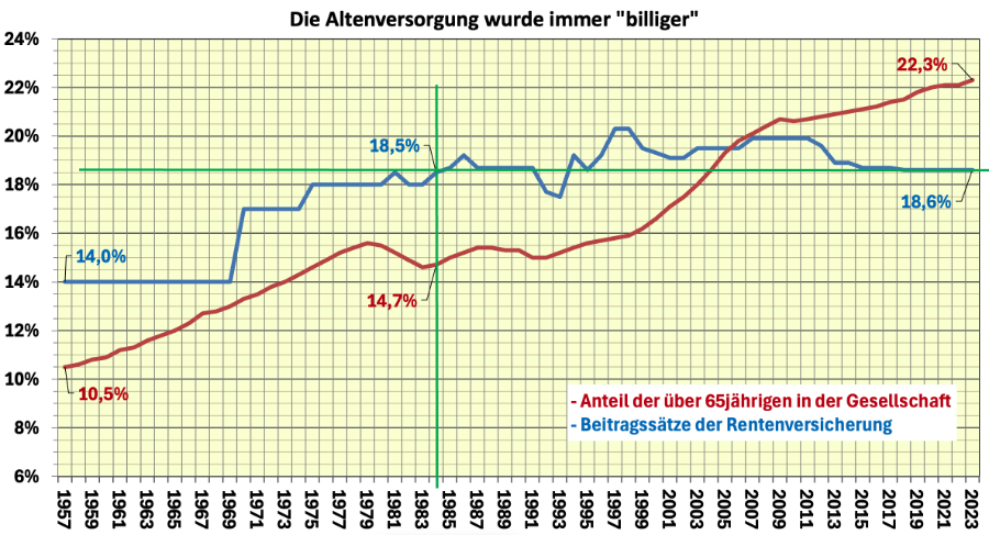 Besonders perfide wird die Lüge der steigenden Beiträge, wenn die Zahl der zu versorgenden Alten herangezogen wird. Die Grafik zeigt den zunehmenden Anteil der über 65jährigen an der Gesamtbevölkerung und die tatsächlich erbrachten Rentenversicherungsbeiträge. Der Anteil der Alten stieg in den vergangenen 40 Jahren um 52 Prozent und die Beiträge wurden auf den Stand von 1984 abgesenkt.