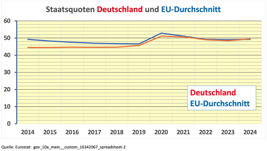 Beim Vergleich der deutschen Staatsquote zum Durchschnitt aller EU-Staaten wird dieser Alarmismus noch deutlicher. Die Quote lag in Deutschland über viele Jahre unter dem EU-Durchschnitt. Jetzt erreicht Deutschland den EU-Durchschnitt. Welch ein Drama – zu lösen ganz einfach über Renten- und Bürgergeldsenkungen und überhaupt beim Sozialen.