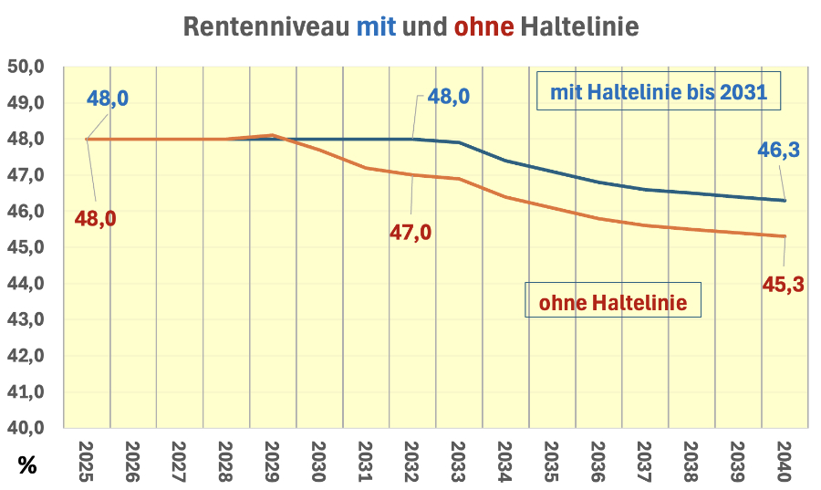 Die Zahlen zeigen auch: das Rentenniveau vor Steuerabzug wird bis 2040 von 48% auf 46,3% weiter sinken. Die Senkung um 1,7 Prozentpunkte entsprechen einem Rückgang um knapp 4%. Das bedeutet, dass sich der Abstand der Renten von der Lohnentwicklung, der von 2004 bis 2024 auf 20 % angewachsen war, um weitere 4% auf dann 24 % erhöhen wird. Den jungen Rentenbekämpfern ist das zu wenig, sie wollen den Abstand auf 26% hoch erzwingen und nennen das „Generationengerecht“. Auch das ein unglaublicher Vorgang.