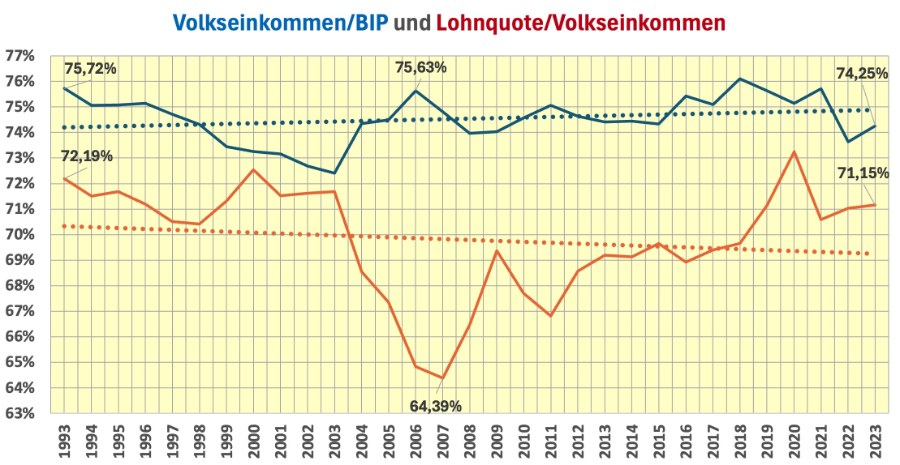 Wenn man von dem langfristigen Durchschnitt der Lohnquote von 71 Prozent ausgeht, hat in den 15 Jahren zwischen 2004 und 2018 eine zusätzliche Umverteilung von 877 Milliarden Euro stattgefunden (in jeweiligen Preisen). Preisbereinigt erreichte das Volumen mit 972 Milliarden Euro fast eine Billion. Für diese grandiose Umverteilungsleistung loben die Klassenkämpfer Gerhard Schröder noch heute. Viele von ihnen verlangen eine Neuauflage – eine Agenda 2030. Begründung dieses Mal: „Putin!“. Der zwingt uns, kriegstüchtig zu werden. Da können wir uns soziale Überversorgung nicht mehr erlauben. Und Kanzler Merz kündigt folgerichtig „schmerzhafte Entscheidungen“ im kommenden Herbst an.