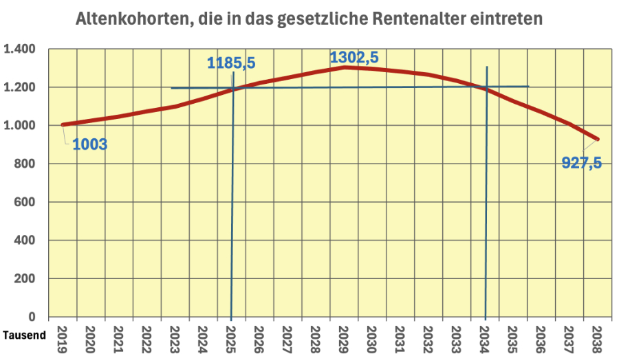 Wie bereits erwähnt gehen die „Babyboomer“ schon seit sechs Jahre in Rente und nicht wie immer behauptet „bald“ oder „demnächst“. Die Zunahme der geburtenstarken Jahrgänge erreicht in vier Jahren (2029) ihren Höhepunkt und danach sinkt die Zahl schnell wieder ab und hat in den folgenden acht Jahren (bis 2037) den Stand von 2019 erreicht. Es ist „müßig“ über diese realen Zahlen zu reden? Die Fakten zeigen, das „Problem“ ist temporär und durchaus im Rahmen der Umlagefinanzierung beherrschbar. Das wird seit etlichen Jahren von der Deutschen Rentenversicherung erklärt und mit sehr validen Daten belegt (1).